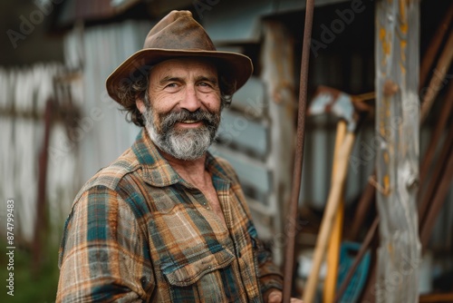A smiling man with a gray beard, wearing a brown plaid shirt and a brown fedora, stands in front of a rustic wooden barn