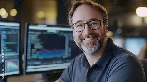 A smiling man with glasses working at his desk in a busy office with warm lighting