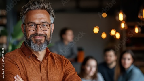 A smiling older man with gray hair and glasses poses confidently in a cozy workspace, emphasizing a warm and inviting atmosphere for creativity and collaboration.