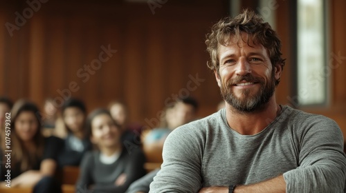 A smiling professor creates a positive classroom atmosphere, interacting with students who are engaged in learning. His friendly approach encourages participation and discussion.