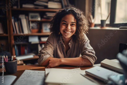 A smiling student girl preparing for exams at her desk at home. Created with Generative AI technology.