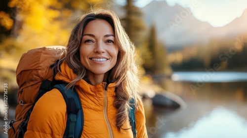 A smiling woman dressed in an orange jacket with a backpack stands by a calm mountain lake, surrounded by fall foliage, capturing the essence of nature and adventure.