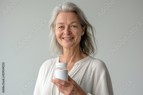A smiling woman of 65 years old with a white jar in her hand on a white background. Photos for advertising medicines and biologically active additives.