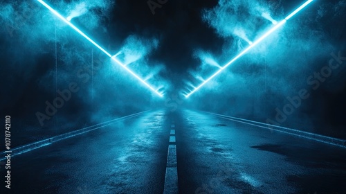 A smoky, dark scene with blue spotlights and neon rays illuminating the empty asphalt street. Light beams pierce through the darkness.