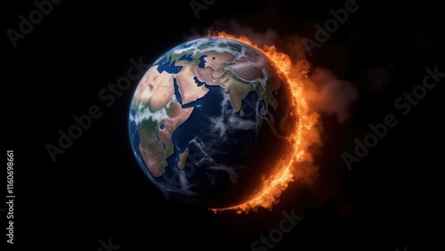A smoldering Earth globe ablaze against a stark black backdrop, with fiery embers engulfing its surface as a blazing sun sets to its right