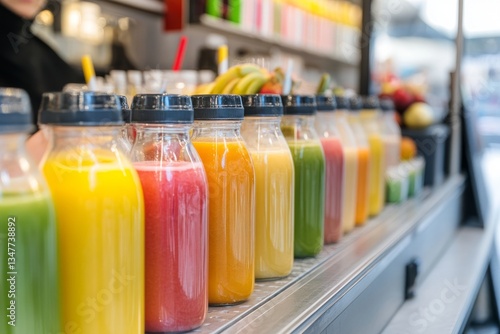 A smoothie bar with fresh fruits, colorful beverages, and friendly staff, health-conscious F&B business, clean and professional composition, copy space, natural color, minimalism, stock photography