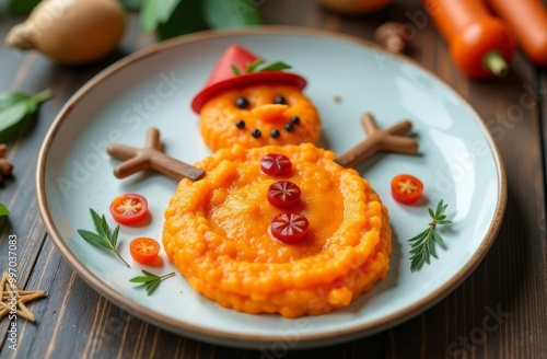A snowman made of orange mashed potatoes lies on a white plate with a New Year's background.