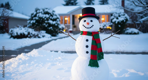 A snowman with a top hat and scarf standing in a snowy yard in front of a house at dusk time ai generated