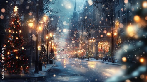A snowy city street illuminated by Christmas trees, with blurred lights and a soft, abstract background creating a warm, inviting holiday scene.