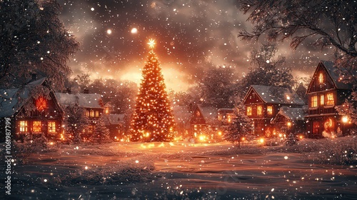 A snowy scene with a Christmas tree and a snowy scene