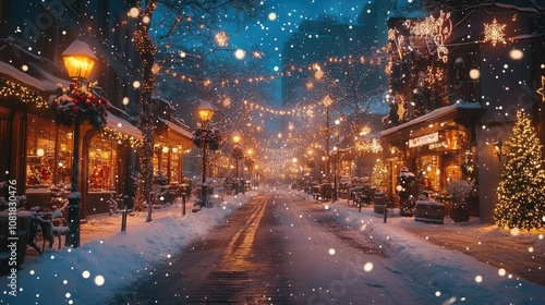 A snowy street in a European town decorated for Christmas, with twinkling lights and falling snow.