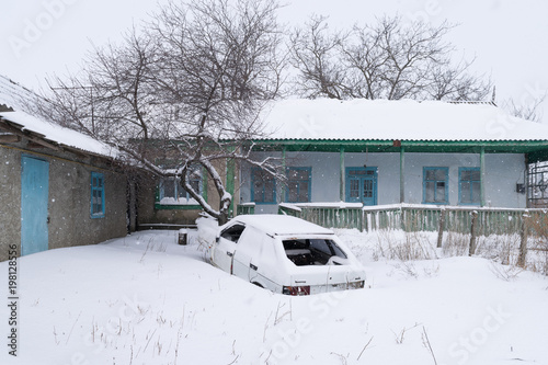 A snowy village yard during a snow storm with an abandoned car in the middle of it