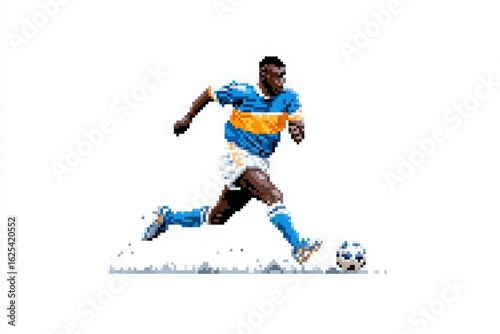 A soccer player wearing a distinctive blue and orange jersey sprints across the field, focused on kicking the ball. The action captures the excitement of a competitive game.