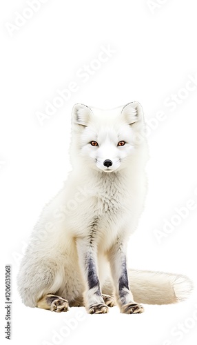 A soft and fluffy arctic fox sitting calmly, its white fur immaculate and its posture serene, contrasting with the clean white backdrop
