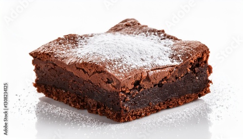 a soft chewy chocolate brownie topped with a dusting of powdered sugar isolated on white background