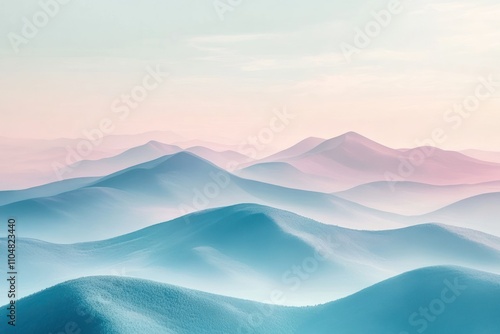 A soft, ethereal landscape of rolling hills bathed in a gentle light. The mountains are shrouded in a soft mist, creating a sense of tranquility and mystery.