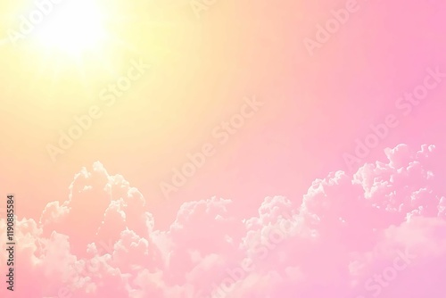 A soft, pastel sky with fluffy clouds illuminated by a bright sun, creating a serene and dreamy atmosphere.