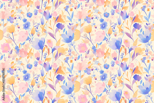 A soft seamless pattern with pastel-colored flowers and leaves, creating a gentle and calming tile ornament, perfect for serene and peaceful designs.