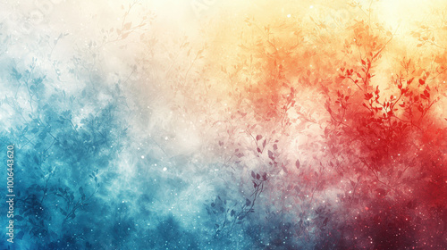 A softly blurred gradient artwork featuring blend of blue, orange, and red hues with delicate foliage silhouettes. This serene composition evokes sense of calm and tranquility