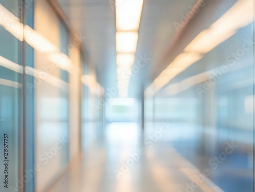 A softly blurred office hallway with doors on either side, illuminated by warm, overhead lights creating a calm atmosphere.