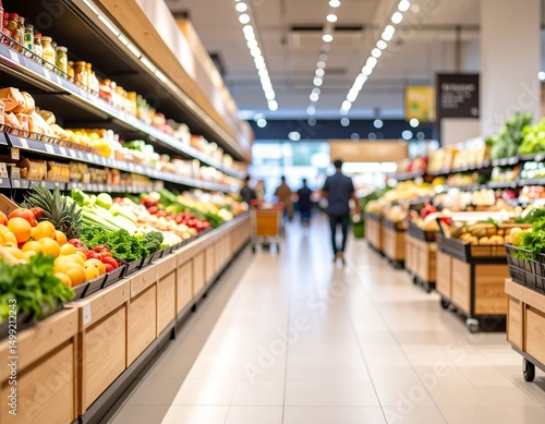 A softly blurred supermarket food section captures the vibrant essence of daily life with shelves full of colorful produce and neatly arranged goods. Hints of shoppers, carts, and signage add depth wh