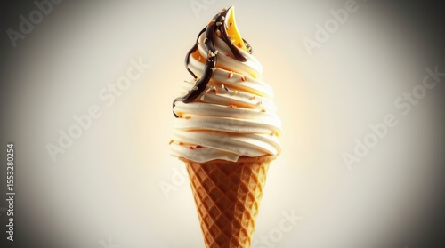 A soft-serve ice cream cone swirled high, drizzled with chocolate and adorned with colorful sprinkles.