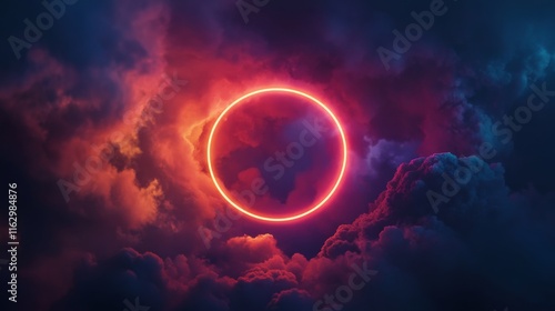 A solar eclipse creates a striking circular outline surrounded by colorful clouds. The scene showcases intense hues of orange and purple while capturing a celestial moment