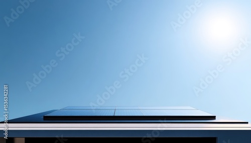 A solar panel on the roof of a house, blue sky with sun in the background, black banner at the bottom of the picture, photorealistic.