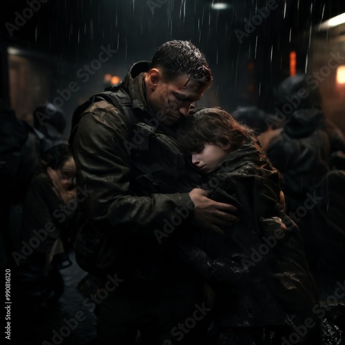 A soldier embraces a child during a tense moment in a dimly lit warzone, providing comfort amidst the chaos. The rain-soaked environment and shadowy figures enhance the emotional intensity of the