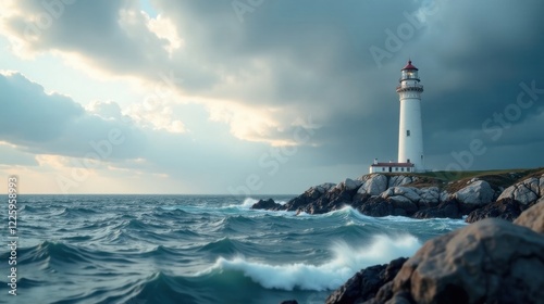 A solitary beacon stands tall amidst a tempestuous ocean, its light a steadfast symbol against the raging waves and brooding sky.