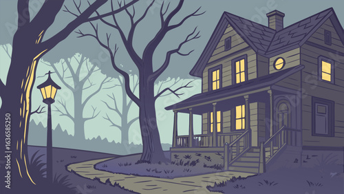 A solitary dimly lit path leads to a welcoming old fashioned house on a misty twilight evening surrounded by bare trees