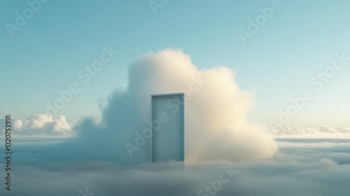 A solitary door emerges from a fluffy cloud formation in a serene, dreamy sky
