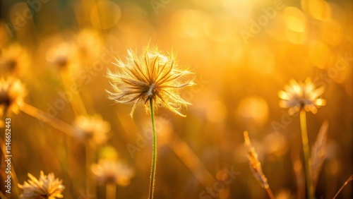 A solitary, feathery flower illuminated by the warm glow of the setting sun, with a backdrop of a blurred, golden field of other flowers.