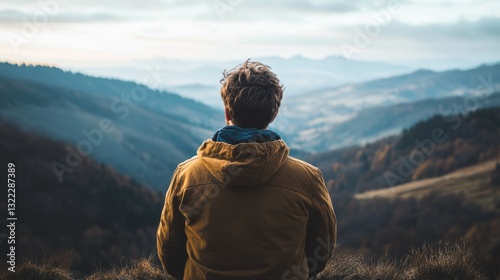 A solitary figure in a hoodie sits on a mountaintop, overlooking a vast, serene valley, lost in thought as dawn breaks.