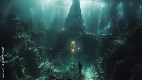 a solitary figure stands before an ancient, underwater city, exuding mystery and awe. The scene is illuminated by ethereal light and the structure seems to be a temple
