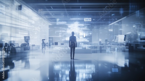 A solitary figure stands in a futuristic, tech-driven office space filled with digital displays.