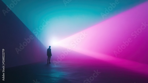 A solitary figure stands in a surreal space, illuminated by vibrant blue and pink beams of light, evoking a sense of wonder and contemplation.