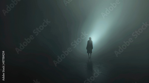 A solitary figure stands in the midst of a foggy, dark environment, illuminated from behind by a mysterious light, creating an eerie atmosphere.