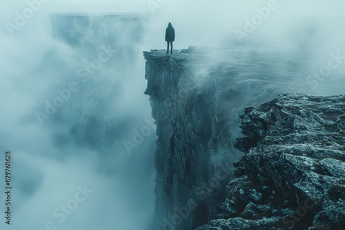 A solitary figure stands on a dramatic cliff shrouded by thick fog, highlighting the scale of nature
