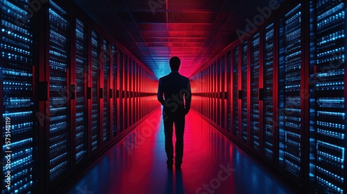 a solitary figure strides through a neon-lit server room a powerful representation of data management and the intricate technological world we inhabit, where information security is paramount