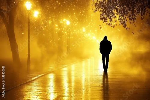 A solitary figure walks down a foggy, illuminated street, surrounded by a warm golden glow, evoking a sense of tranquility and introspection.