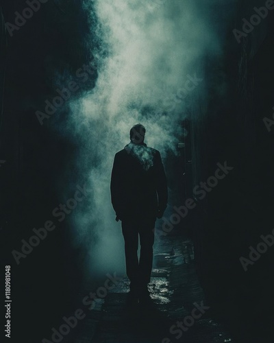 A solitary figure walks through a foggy alley, evoking mystery and solitude.