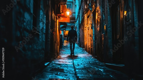 A solitary figure walks through a narrow, dimly lit alleyway illuminated by a vintage street lamp, showcasing reflections on wet cobblestones in a vibrant nighttime scene.