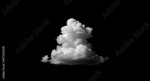 A solitary fluffy white cumulus cloud isolated on a solid black background, a symbol of nature, dreams, and creative thought