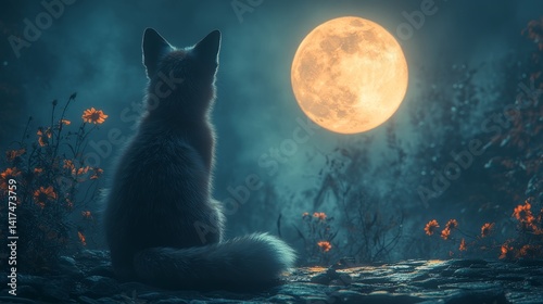 A solitary fox admires the bright full moon, surrounded by enchanting flowers in a tranquil nighttime setting