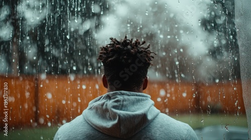A solitary man in a hoodie gazes out at the rain-soaked world through a window, reflecting on emotions and solitude, capturing the beauty of introspection amidst dreary weather.