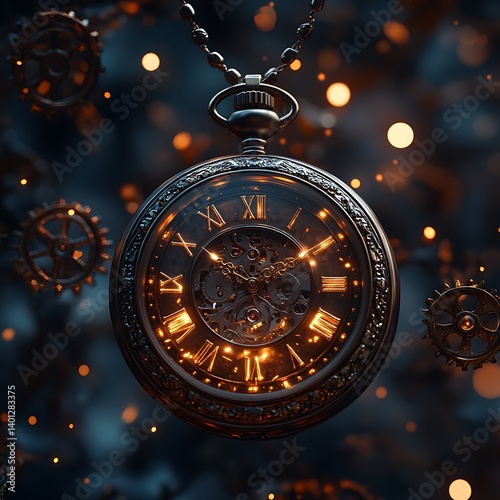 A solitary pocket watch suspended in mid-air, gears and cogs floating around it, glowing with an ethereal light, dark industrial backdrop, steampunk aesthetic, ultra-detailed.