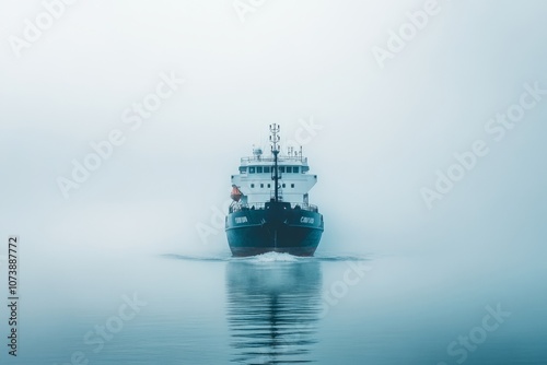 A solitary ship navigates through thick fog. It symbolizes exploration and adventure. The tranquil waters mirror the uncertainty of the journey ahead. Generative AI