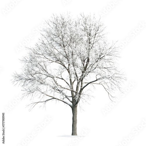 A solitary snow-covered tree stands tall against a white backdrop. the beauty of winter. with delicate branches adorned in frost. symbolizing tranquility and the essence of nature