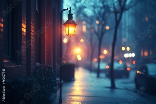 A solitary streetlight illuminates an empty city sidewalk at night, casting a peaceful glow.